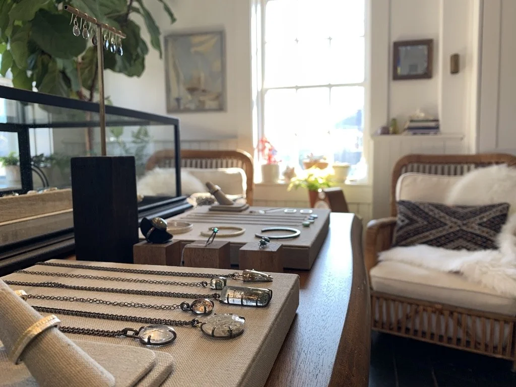 A lifelong student of the arts, Jennifer's path to jewelry was unconventional but richly layered, shaped not by a single school or institution, but through years of immersive learning, curiosity, and experimentation. A senior year Art History class proved to be foundational and over the following years of study and travel, Jennifer’s fascination with form, texture, and cultural nuance took shape. A self-described "perpetual student”, and largely self-taught as a metalsmith, her technical and design skills evolved organically over time, driven by a hands-on approach and an enduring fascination with the natural materials she works with. Years of immersion in the island’s independent jewelry scene helped to hone her skills, industry knowledge, and individual aesthetic.